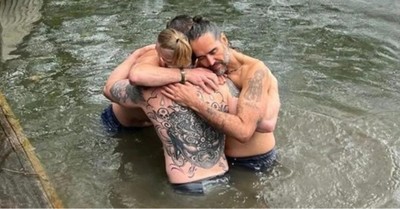 Russell Brand posted a photo on Instagram of himself embracing Bear and another friend during the baptism. The caption reads, “Me, Bear Grylls, The River Thames and of course, The Holy Spirit.”